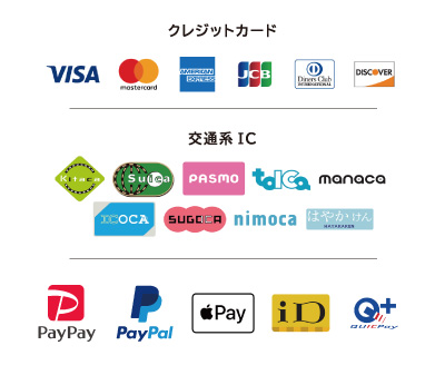 現金、電子マネー(PayPay、Alipay+、PayPal、交通系IC、iD、QUICPay)、クレジットカード(VISA、MasterCard、American Express、JCB、Diners Club、Discover)、銀行振込に対応しております。